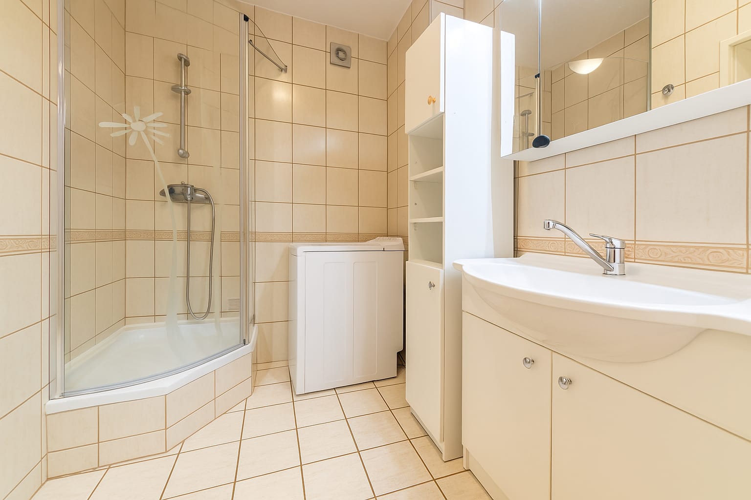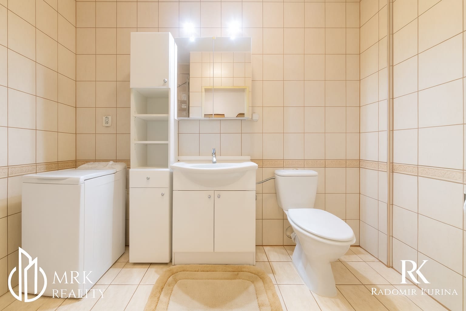 Po ľavej strane sa nachádza kúpeľňa so sprchovým kútom a toaletou.