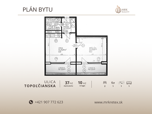 Výmera: obytná plocha 37 m² + 2×5 m² loggie